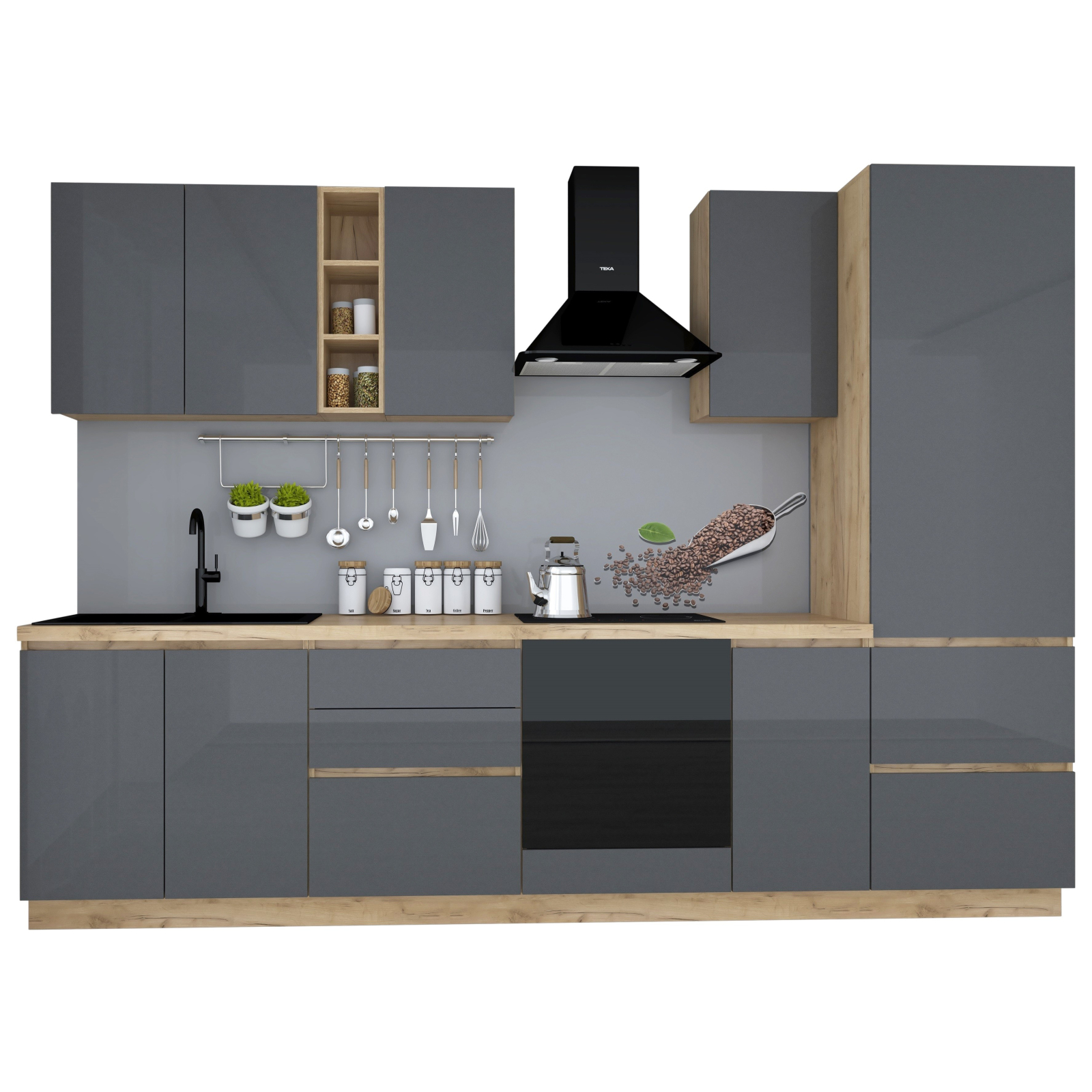 Set de mobilier pentru bucătărie, realizat din PAL melaminat Stejar K003 și fronturi MDF AGT antracit lucios, cu design contemporan și configurație premium. Bucătăria oferă spațiu generos de depozitare, funcționalitate ridicată și finisaje moderne, potrivite pentru bucătării mari.