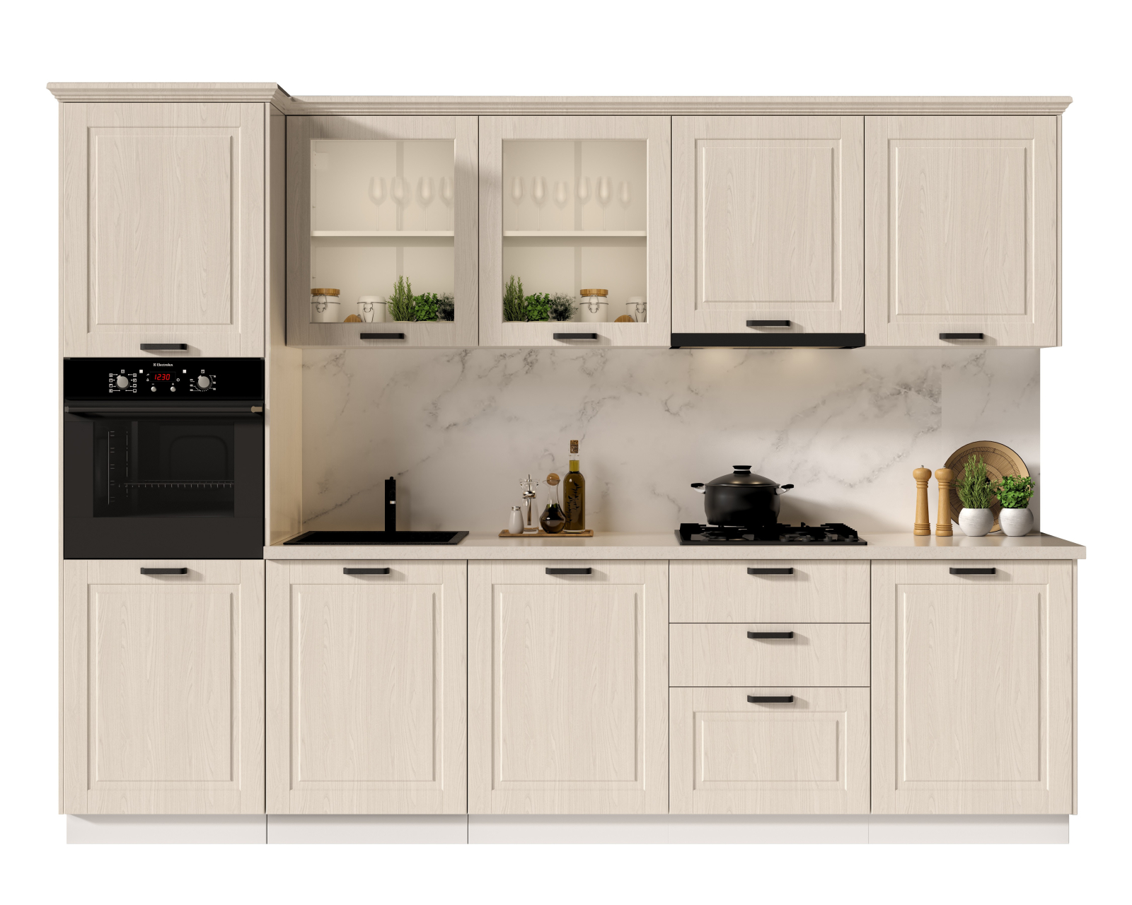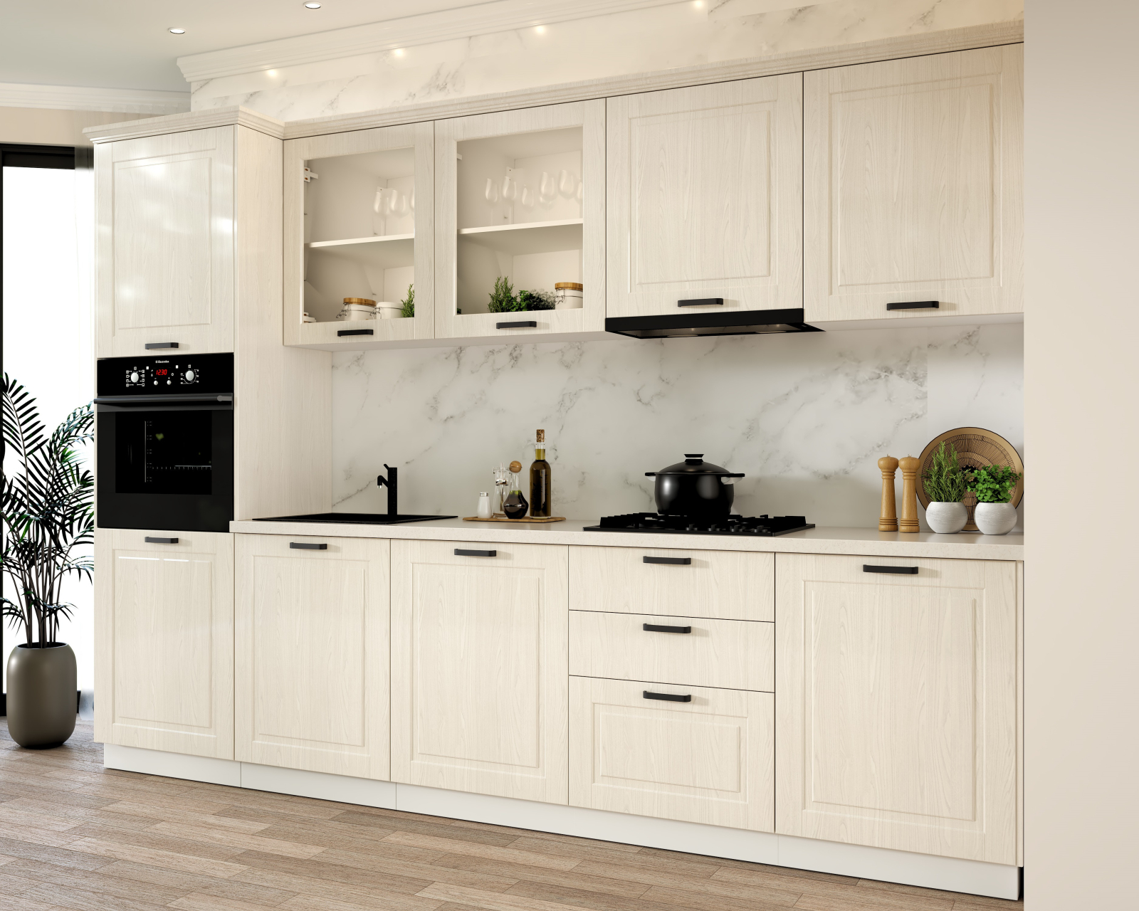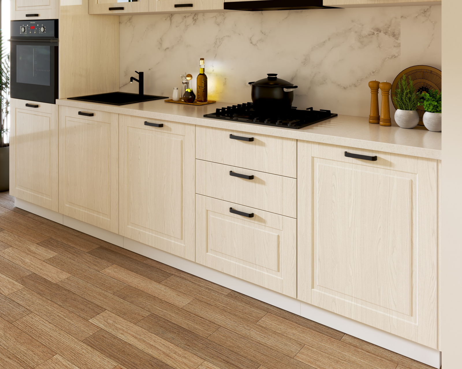 Set de mobilier pentru bucătărie, realizat din PAL melaminat și MDF infoliat, cu design contemporan și compartimentare eficientă pentru organizarea spațiului.