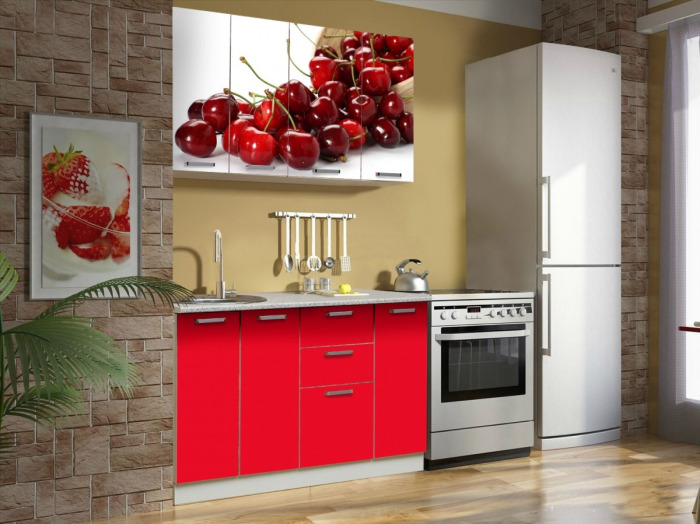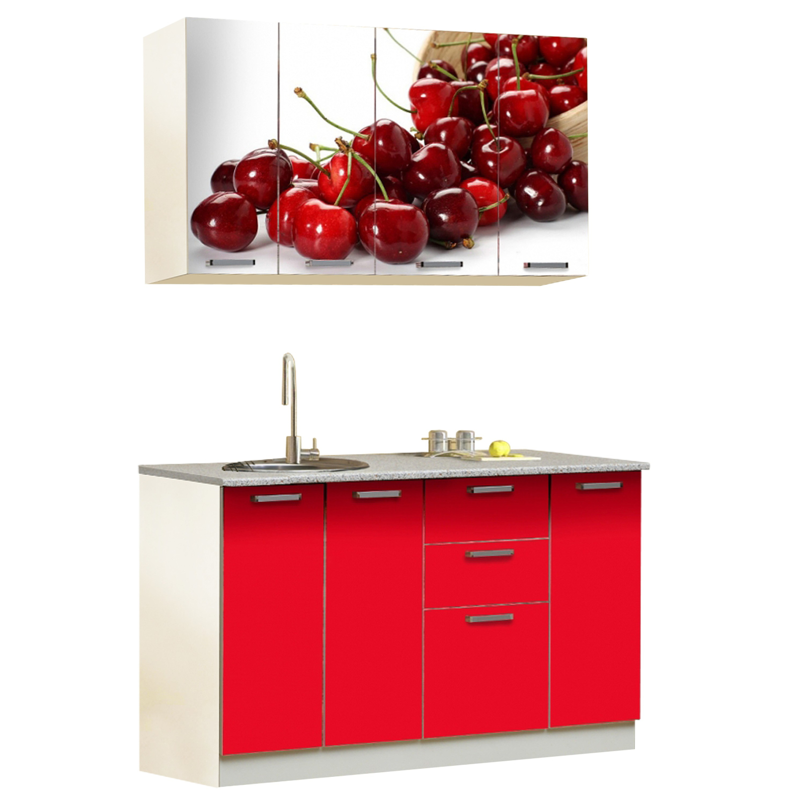 Set de mobilier pentru bucătărie cu fotoamprentă CIREȘE, în combinație de culori alb și roșu, cu design modern și structură compactă. Configurația este ideală pentru bucătării de dimensiuni reduse, oferind funcționalitate și spațiu de depozitare eficient.