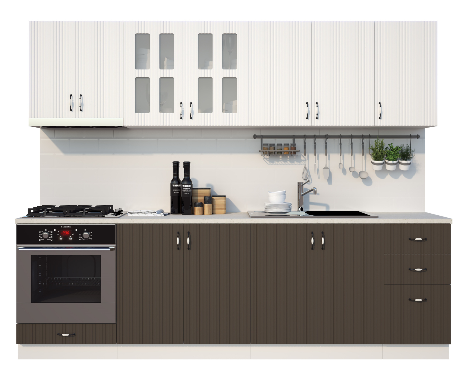 Set de mobilier pentru bucătărie, realizat din PAL melaminat și MDF infoliat, cu design modern și structură practică, conceput pentru organizarea eficientă a spațiului.