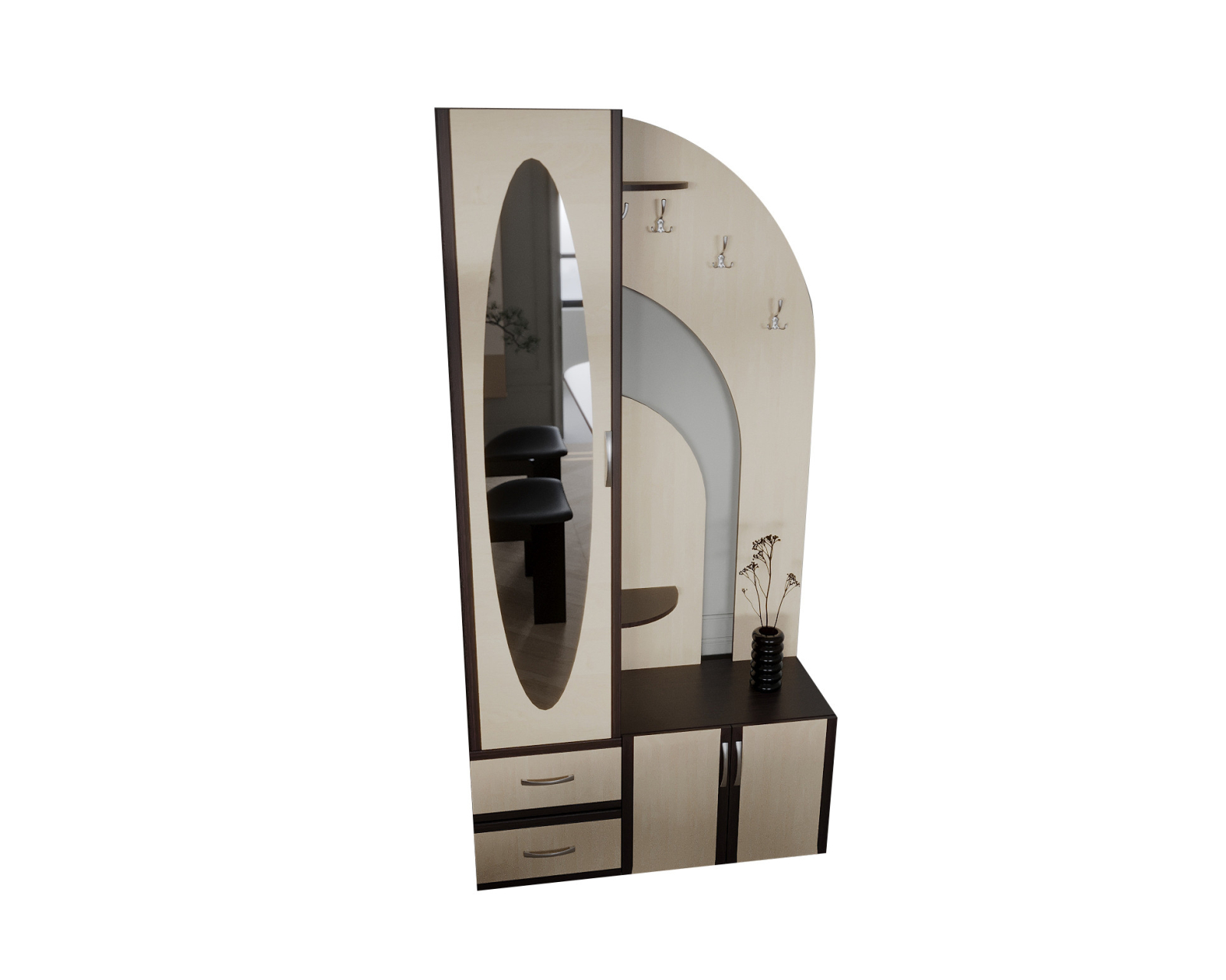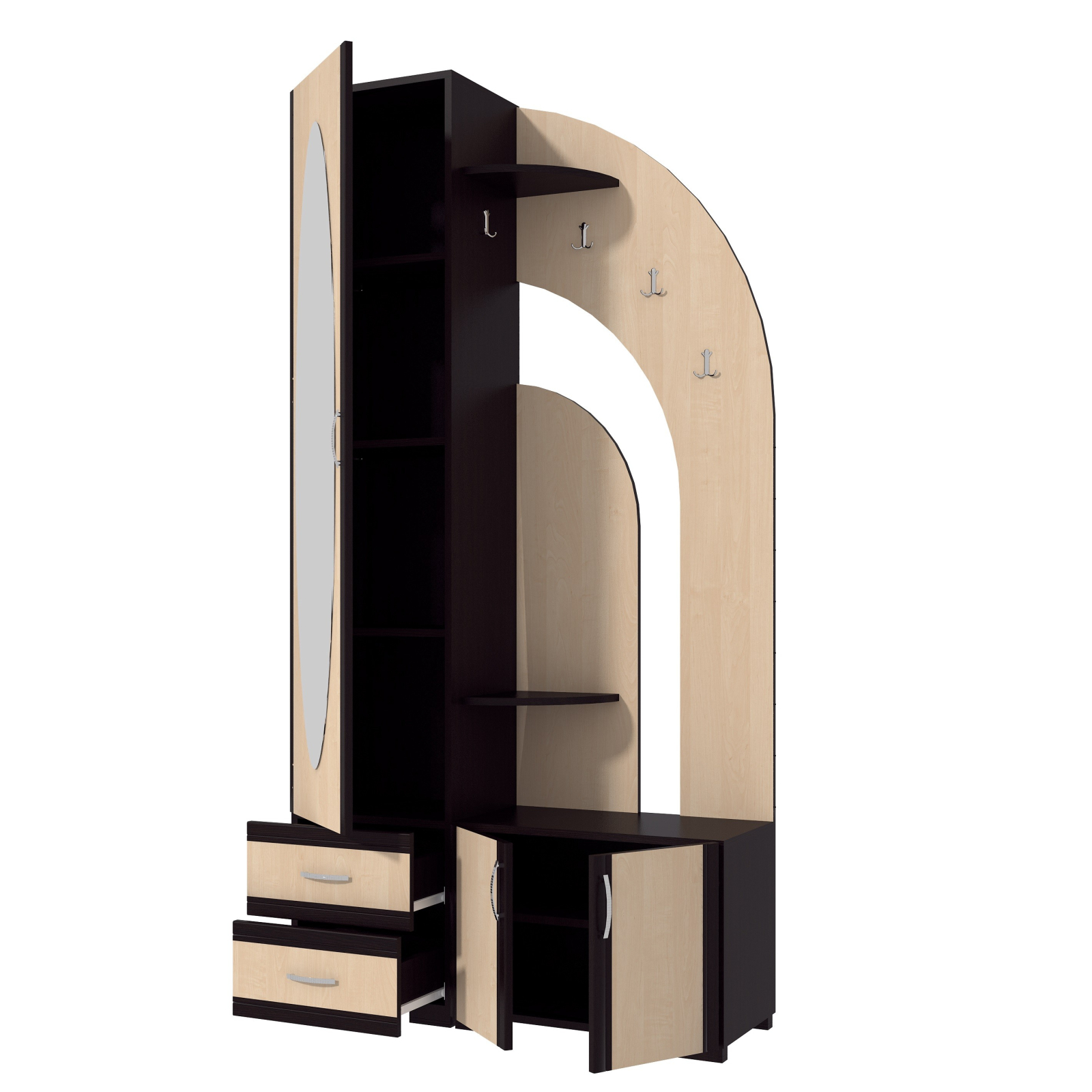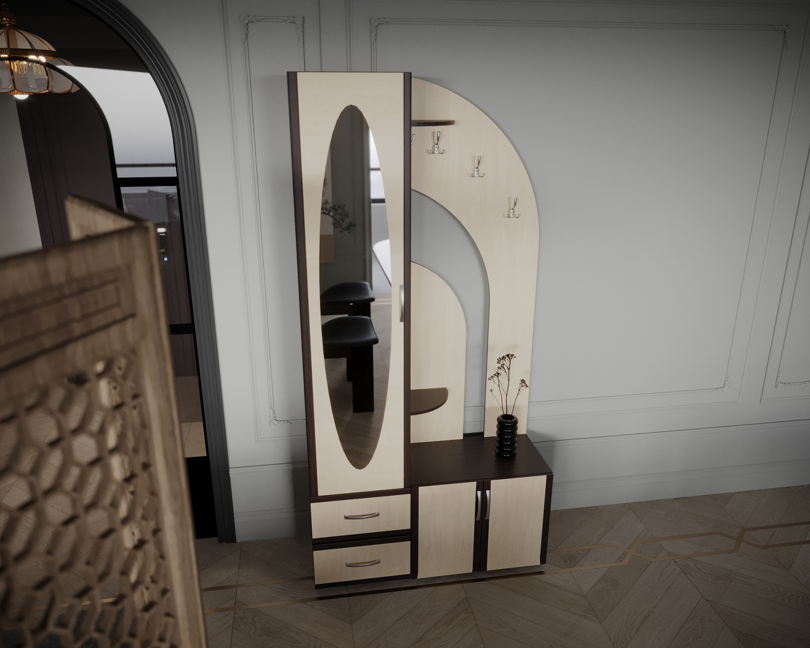 Cuier pentru hol, cu design contemporan, prevazut cu agatatori duble, oglinda, sertare si rafturi pentru depozitare.