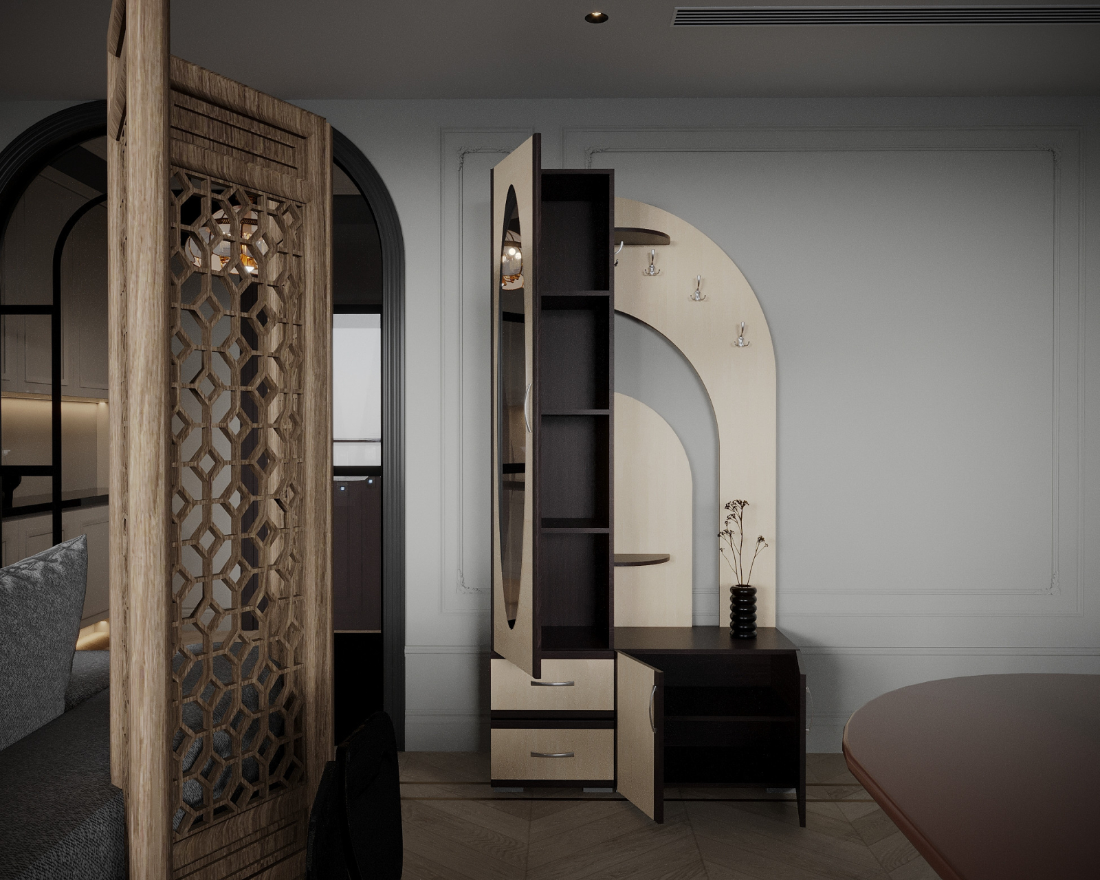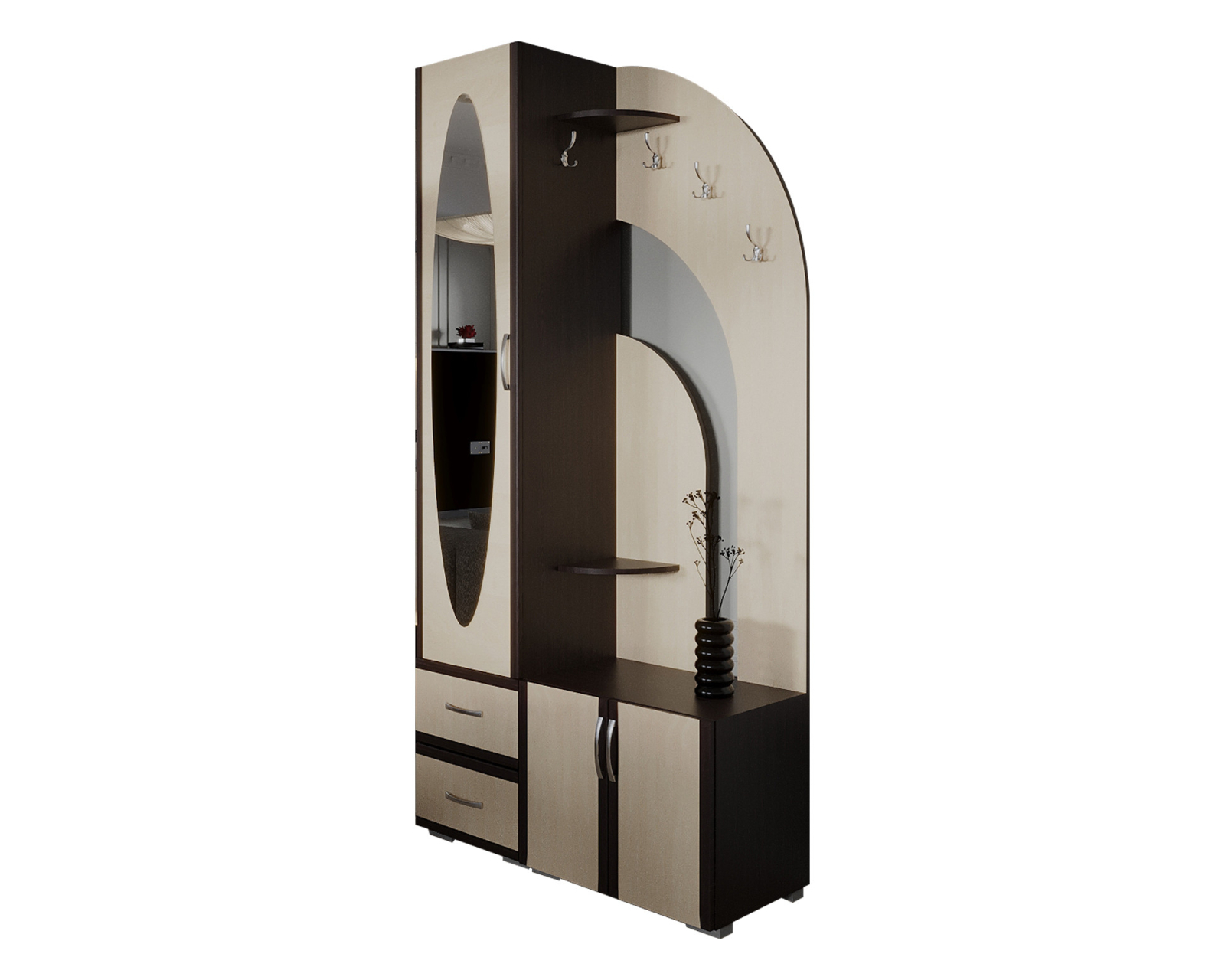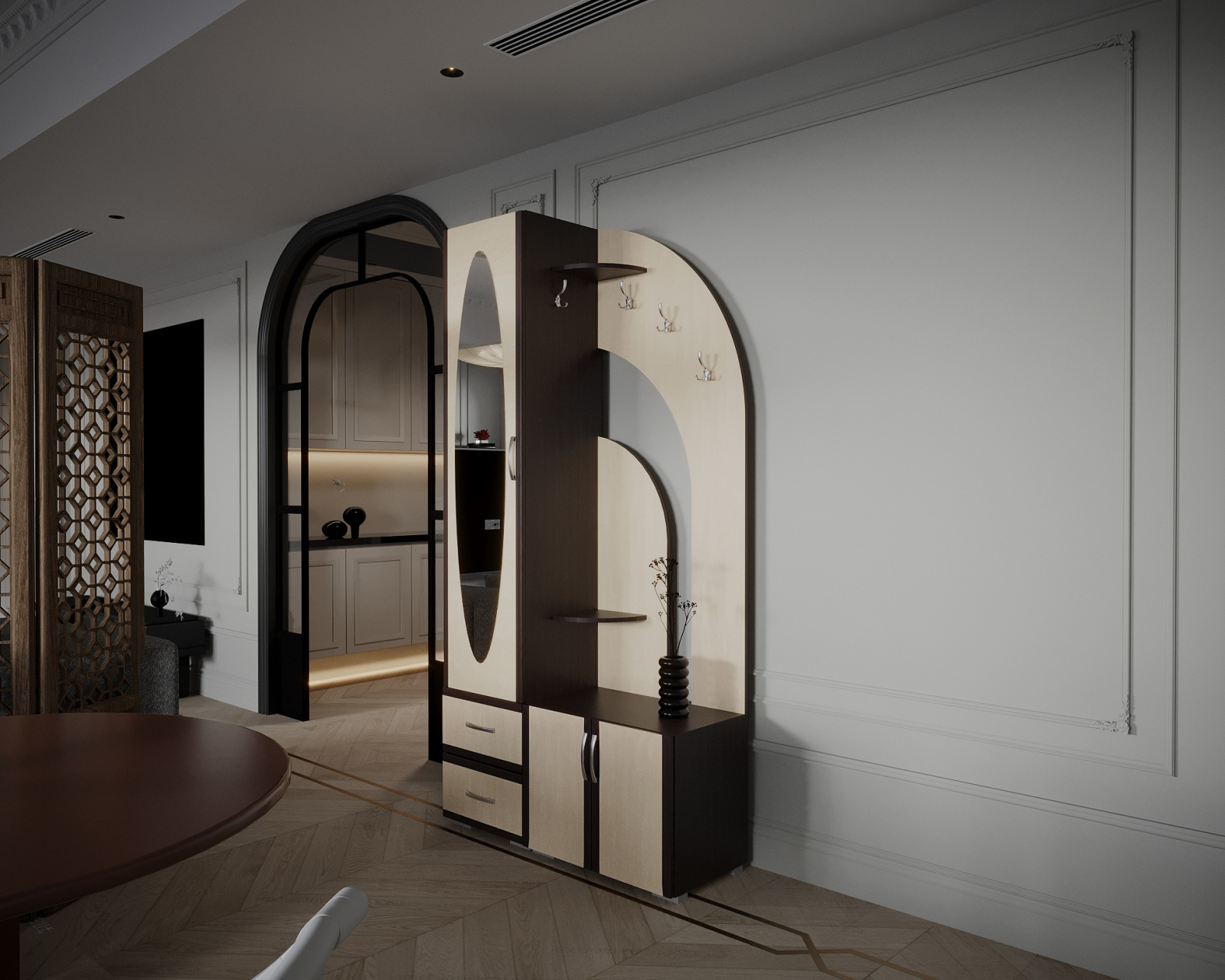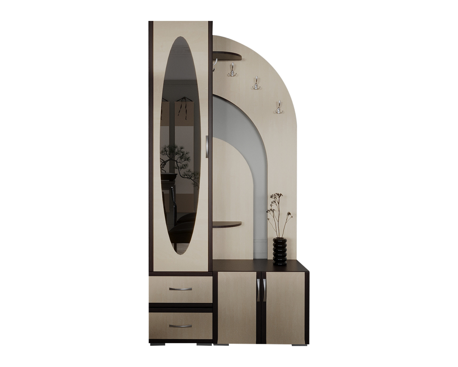 Cuier pentru hol, cu design contemporan, prevazut cu agatatori duble, oglinda, sertare si rafturi pentru depozitare.