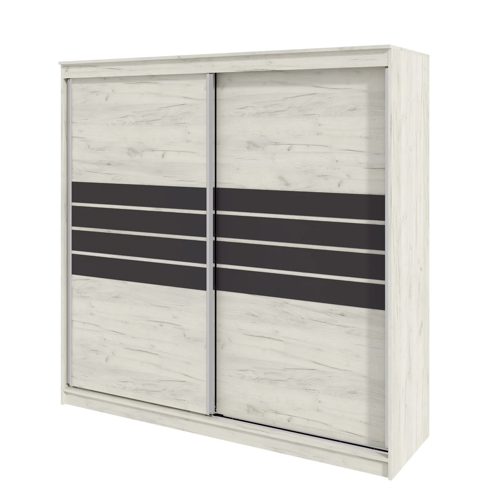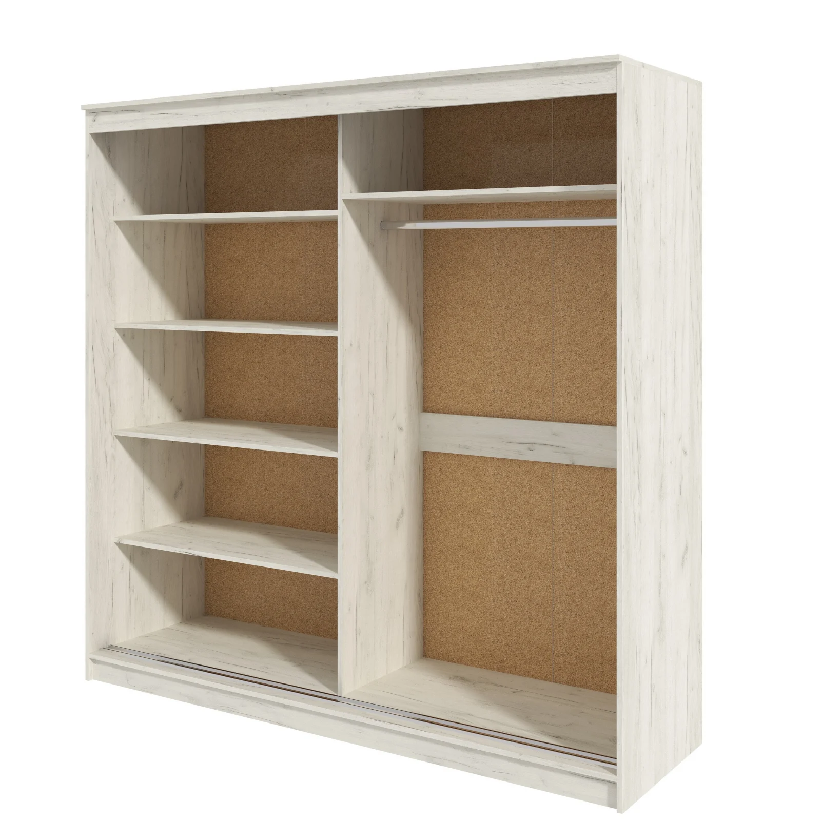 Set de mobilier pentru dormitor, realizat din PAL melaminat K001, cu design modern si finisaj uniform. Setul este compus din dulap cu rafturi si bara pentru haine, pat matrimonial, comoda si doua noptiere, oferind o solutie completa pentru amenajarea dormitorului.
