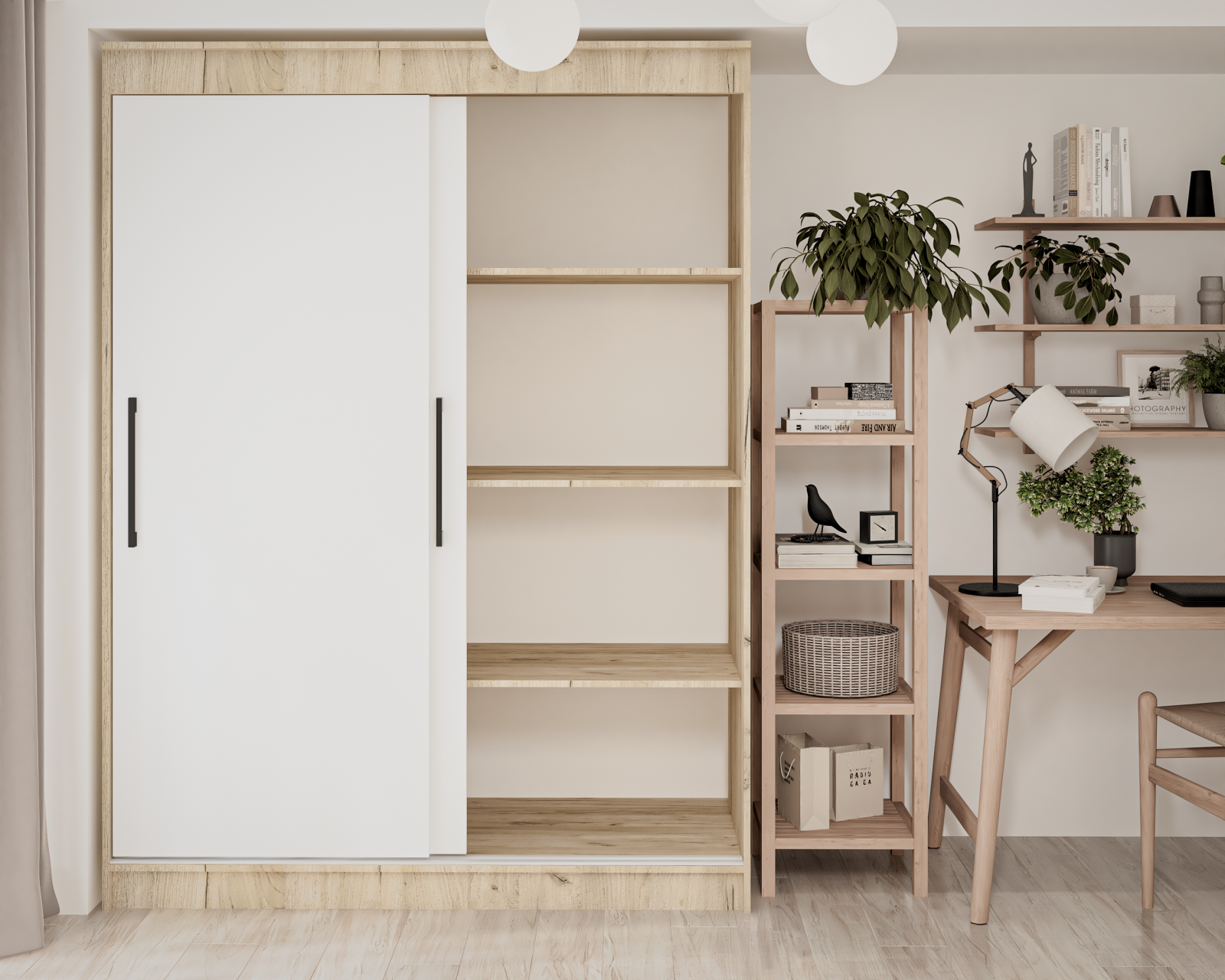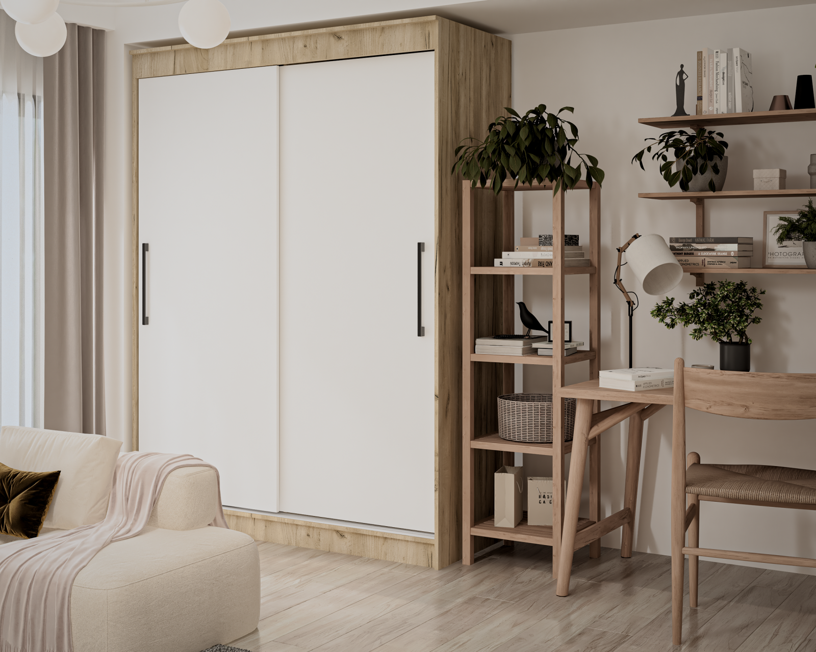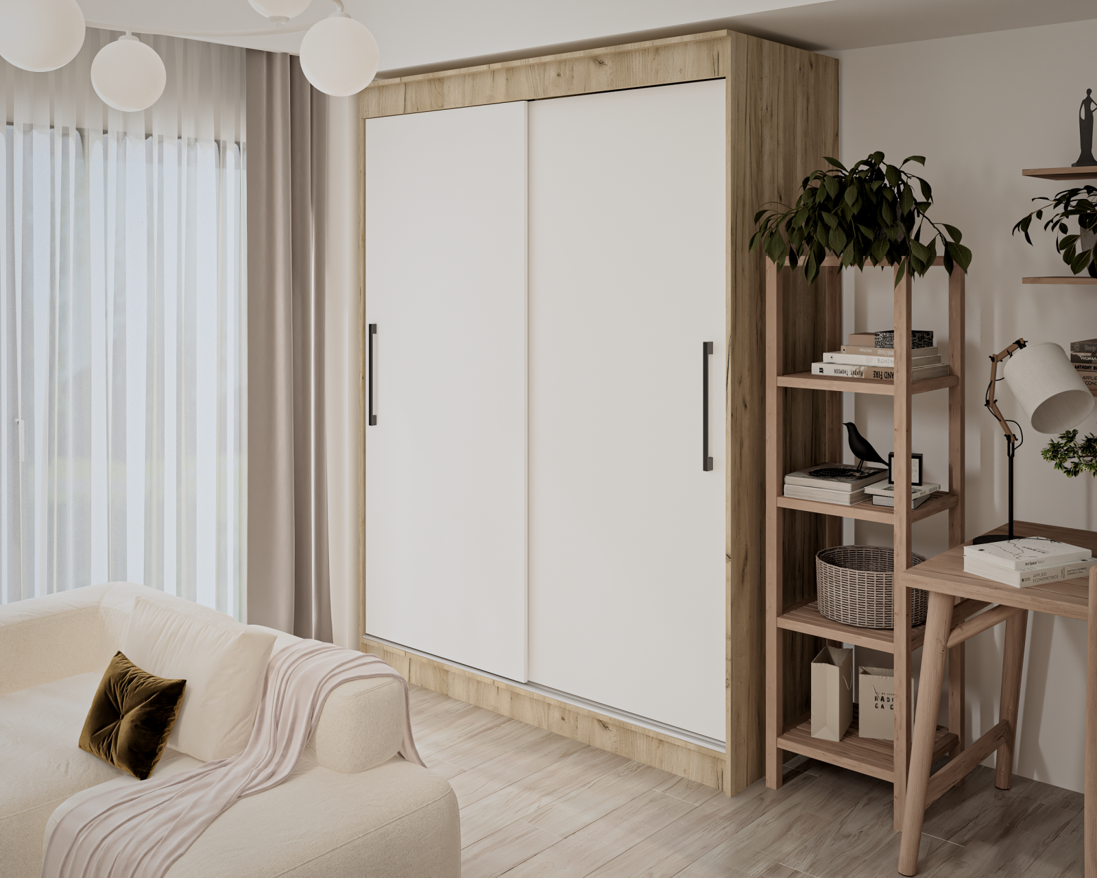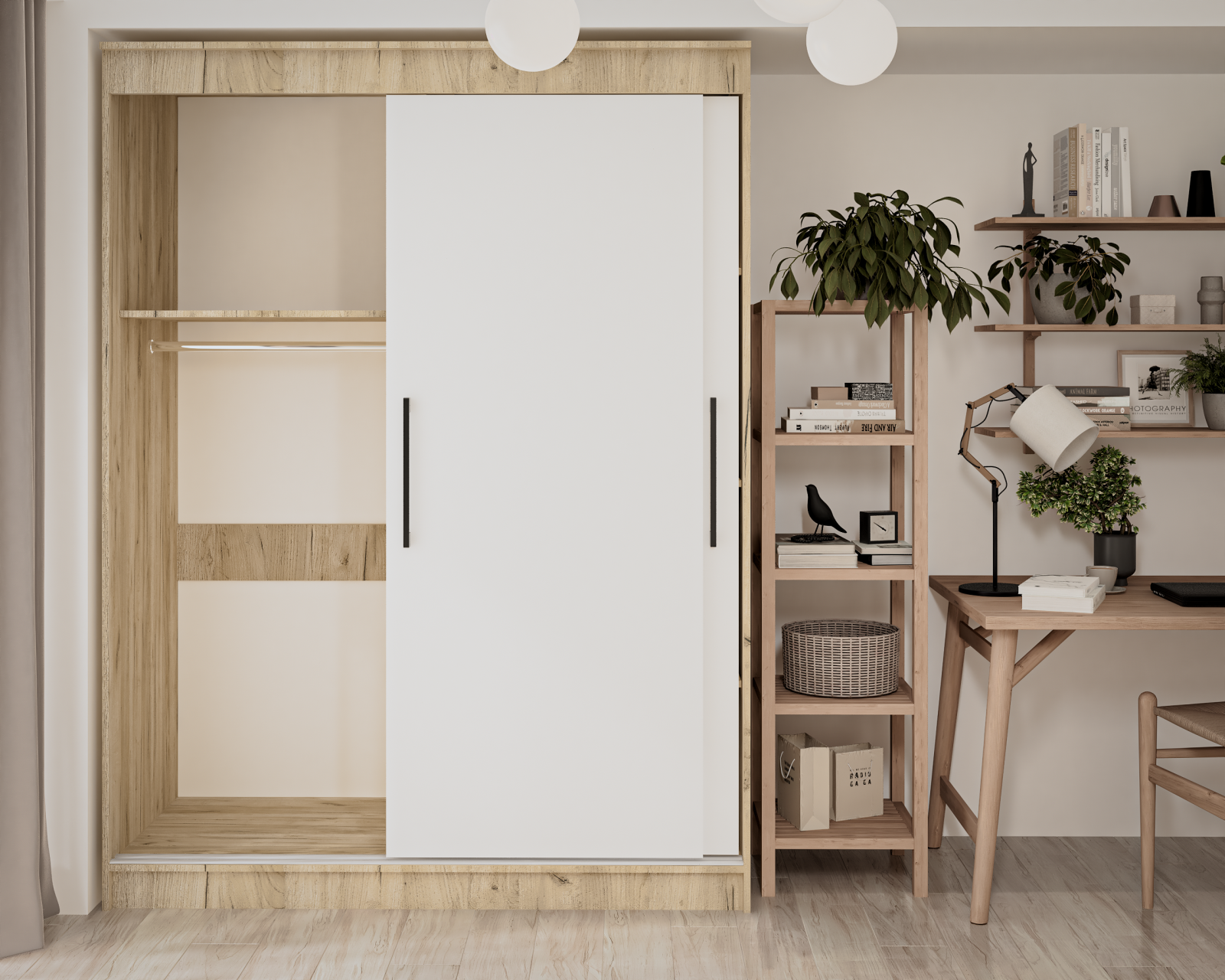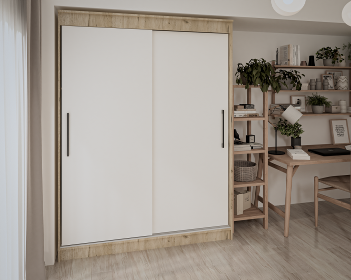Dulap modern cu uși culisante, conceput pentru organizare eficientă în dormitor sau hol. Este prevăzut cu bară pentru haine și rafturi pentru depozitare, iar sistemul de culisare cu șină și profil de mâner din aluminiu asigură o utilizare practică și durabilă.
