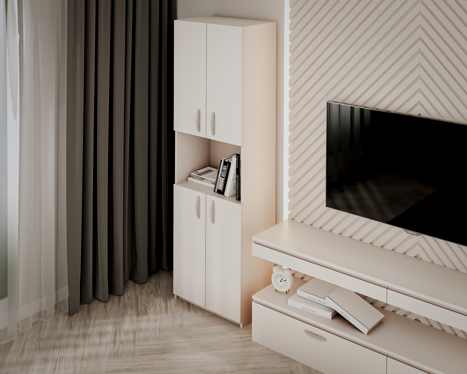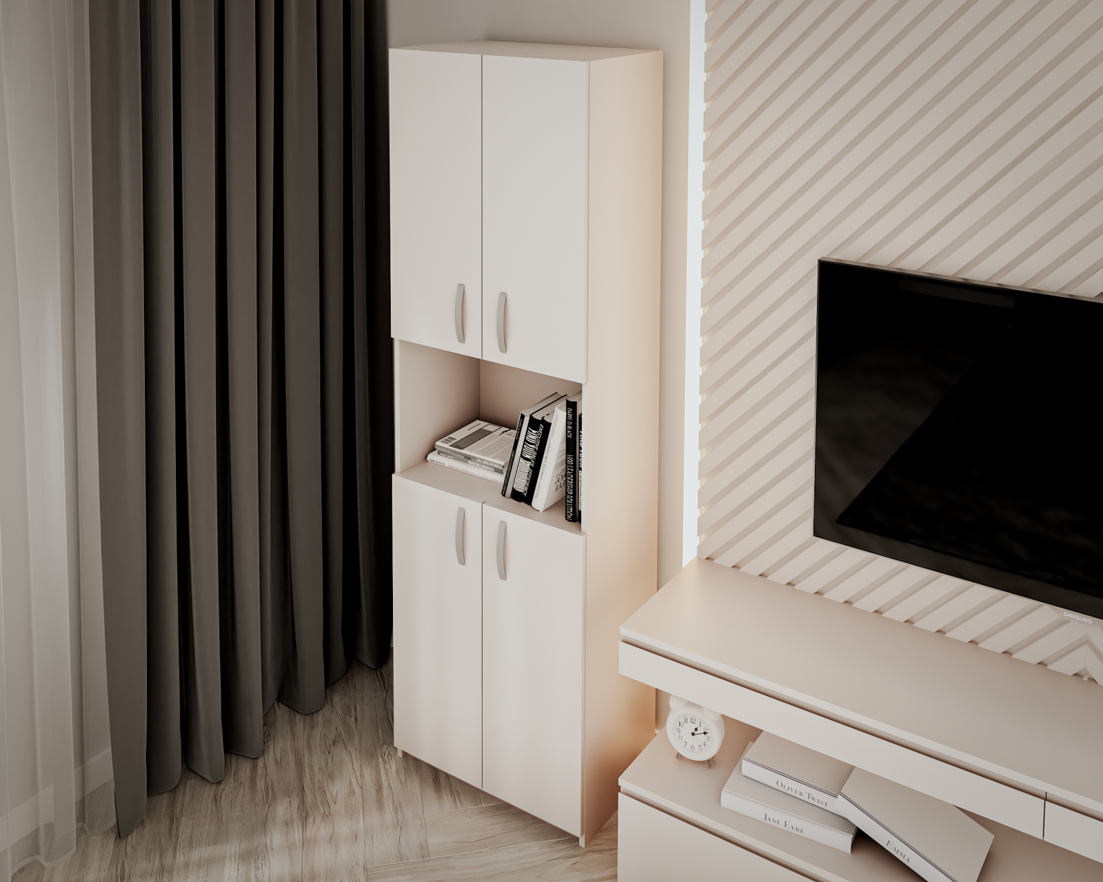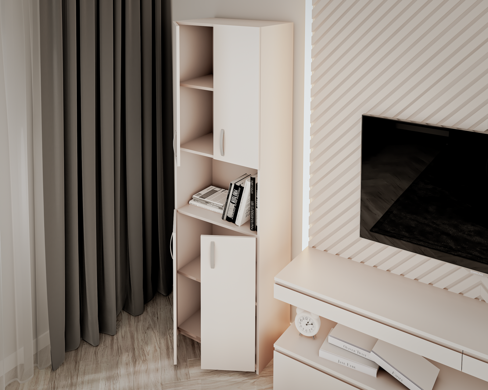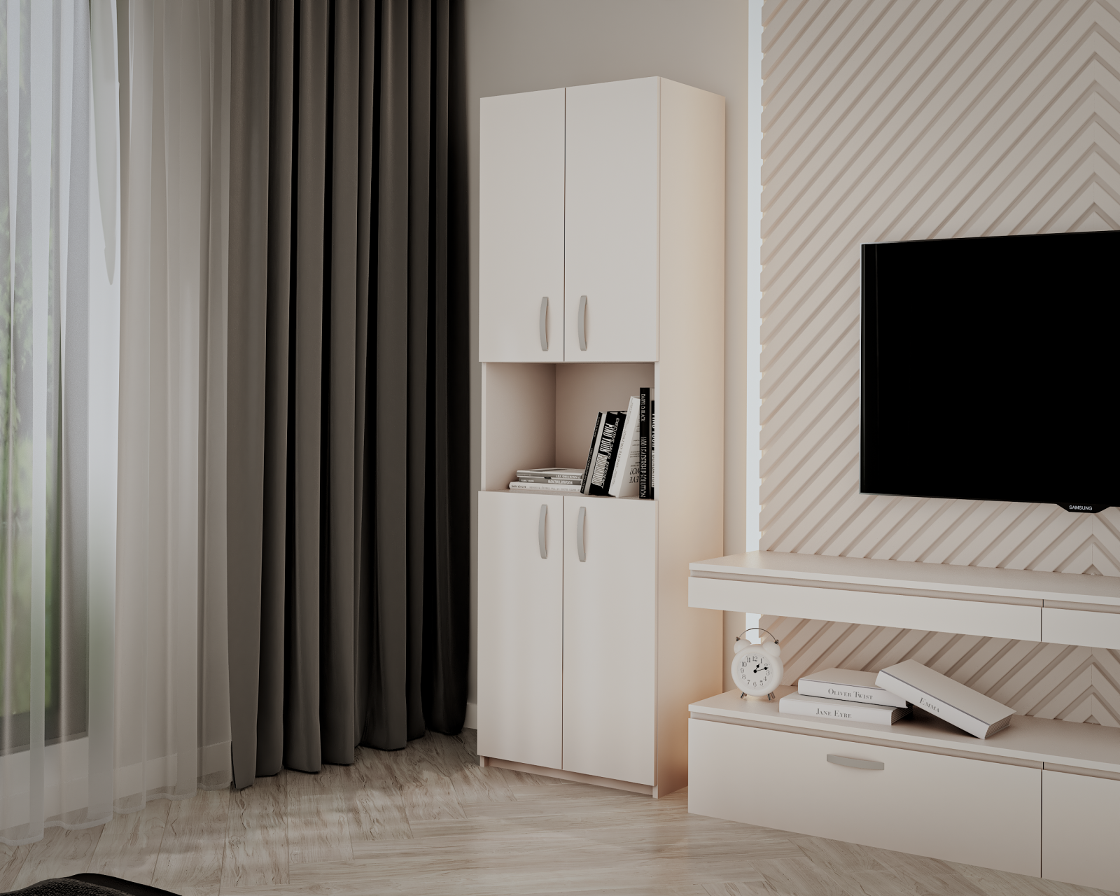 Dulap realizat din PAL melaminat, cu design contemporan și compartimentare verticală, prevăzut cu spații multiple pentru depozitare, potrivit pentru organizare eficientă în dormitor sau hol.