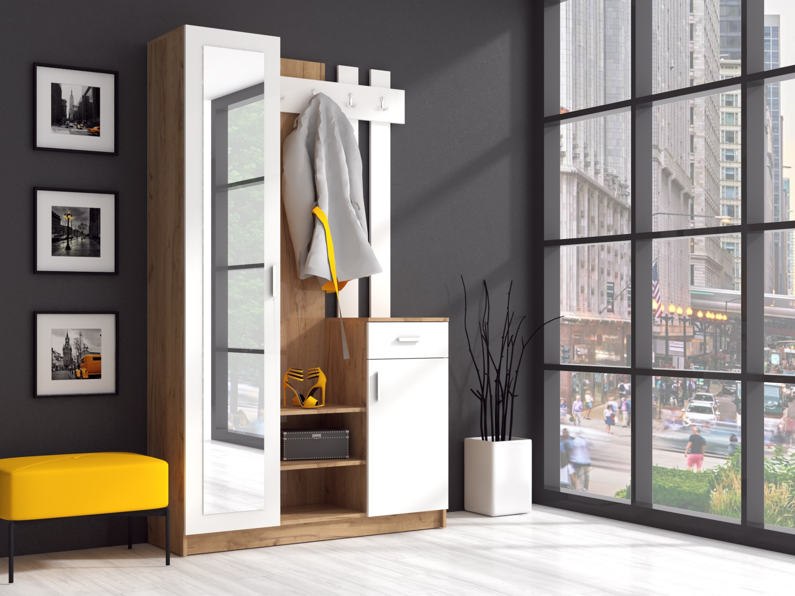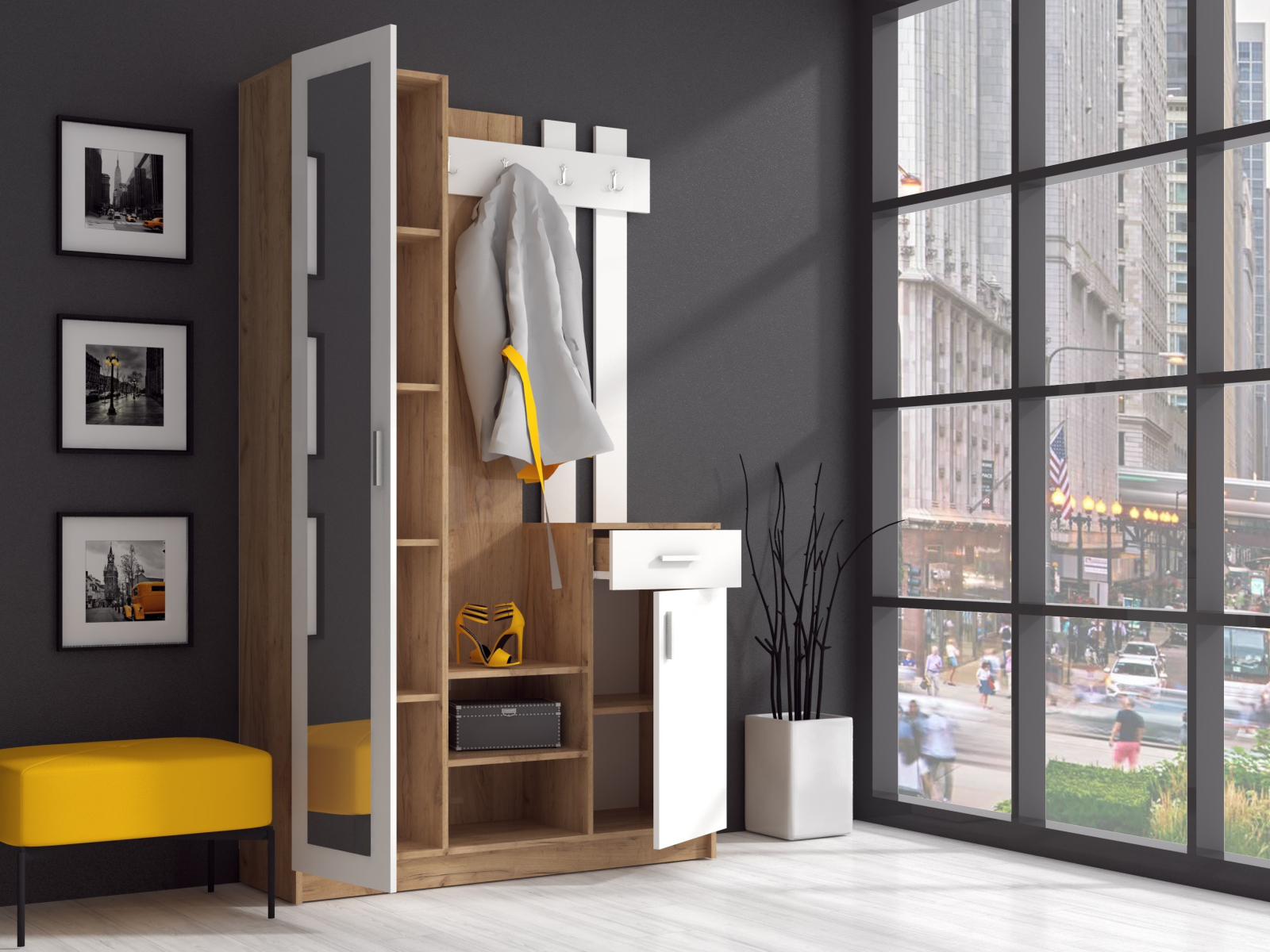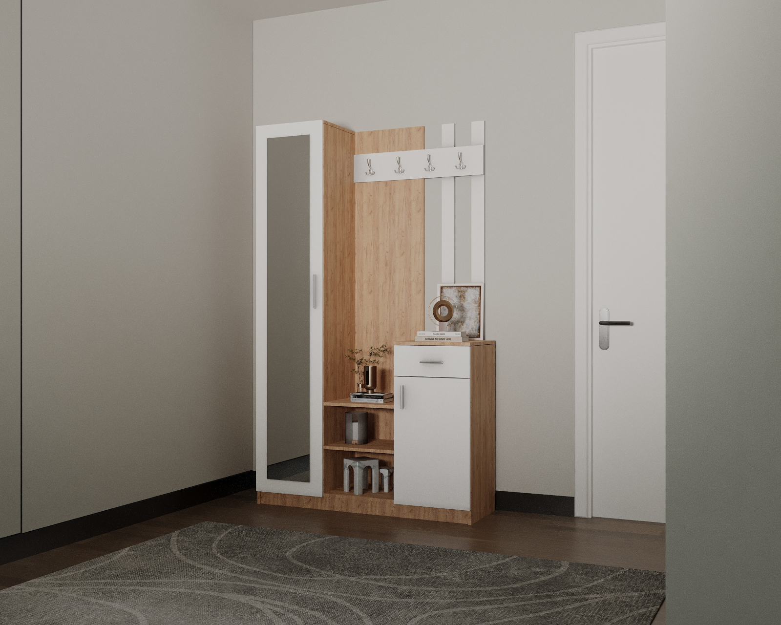 Cuier pentru hol realizat din PAL melaminat, cu design modern și compartimentare practică, prevăzut cu oglindă, polițe, sertar și agățători duble, ideal pentru organizarea eficientă a spațiului de intrare.