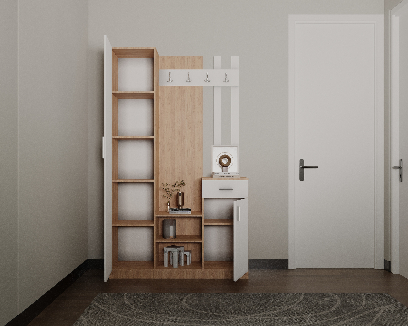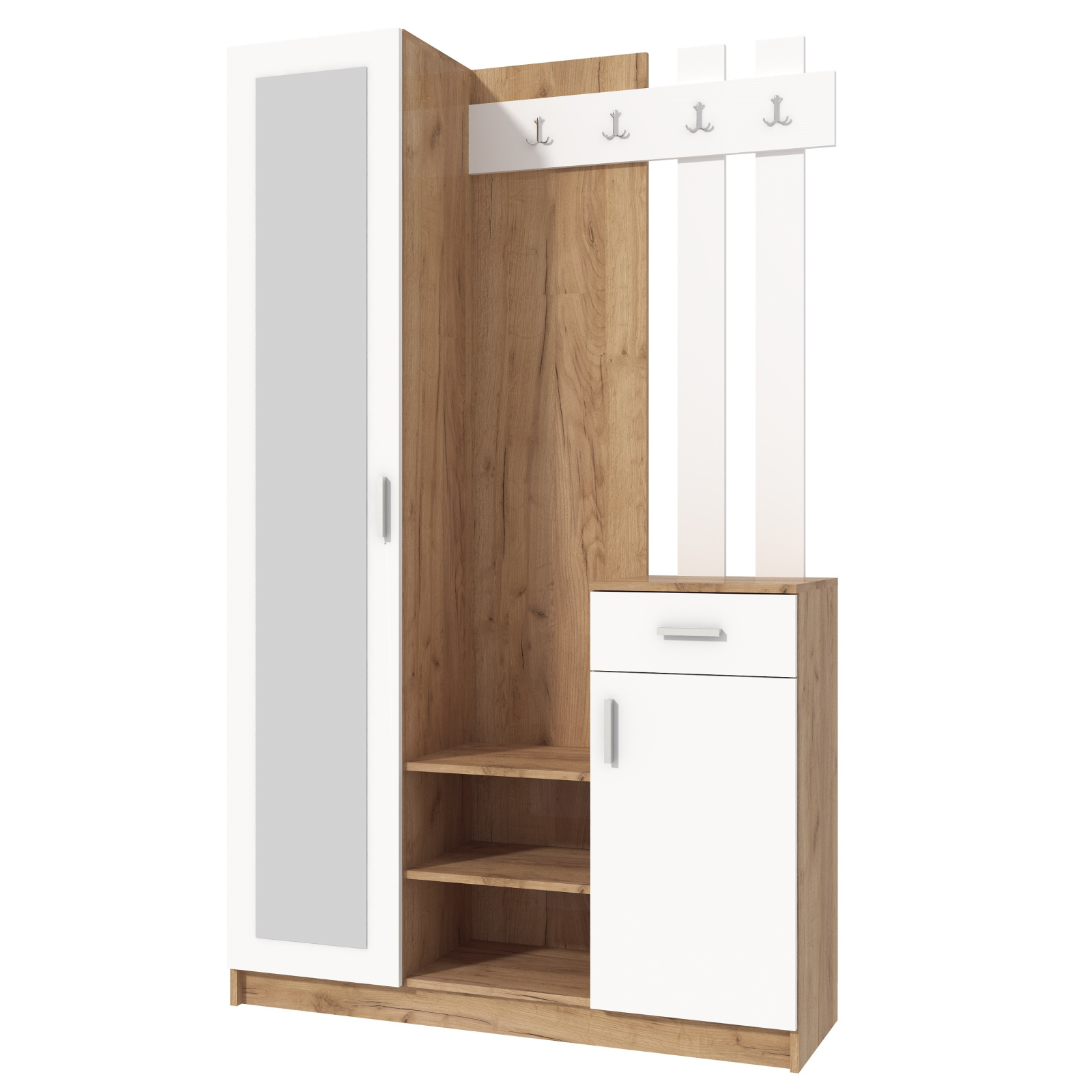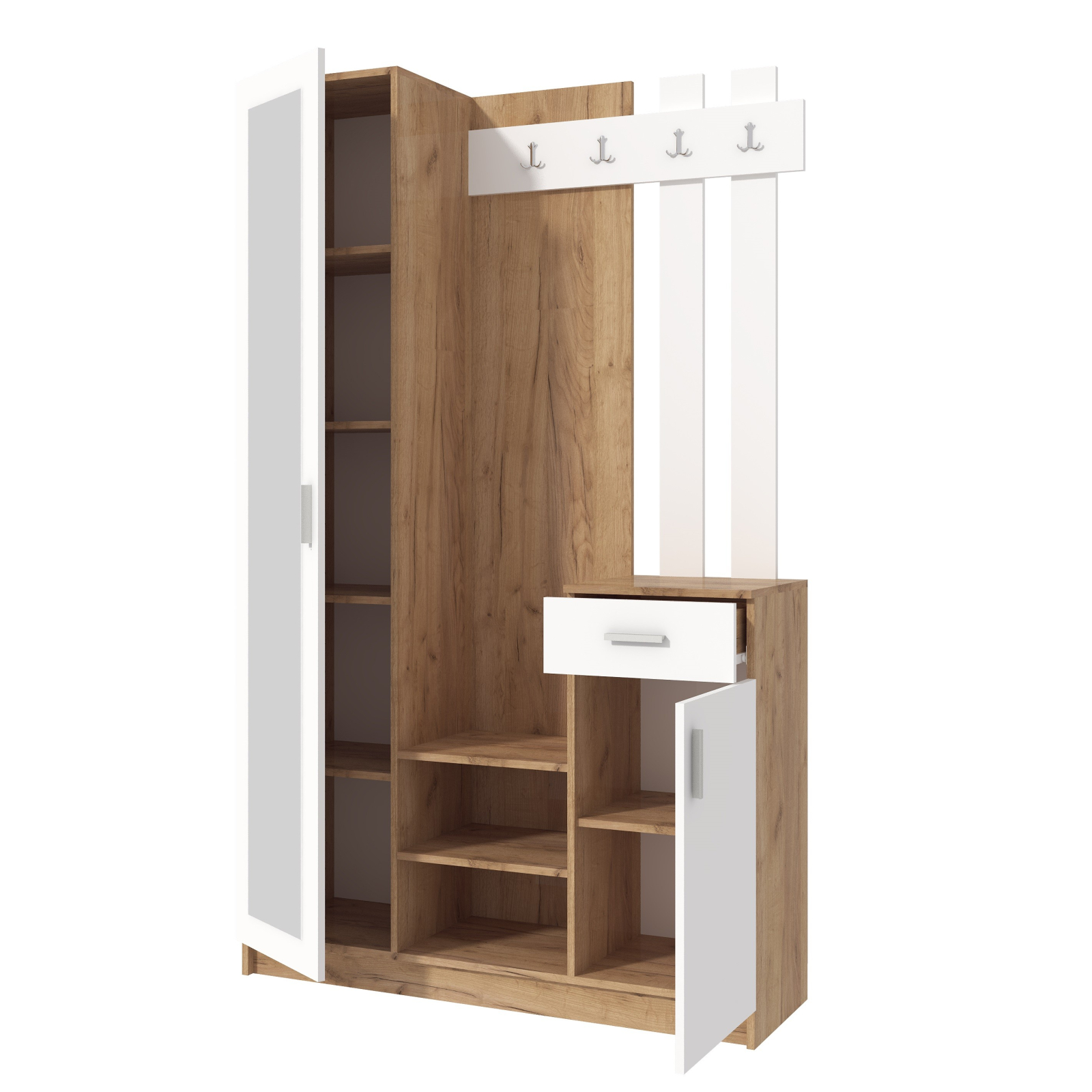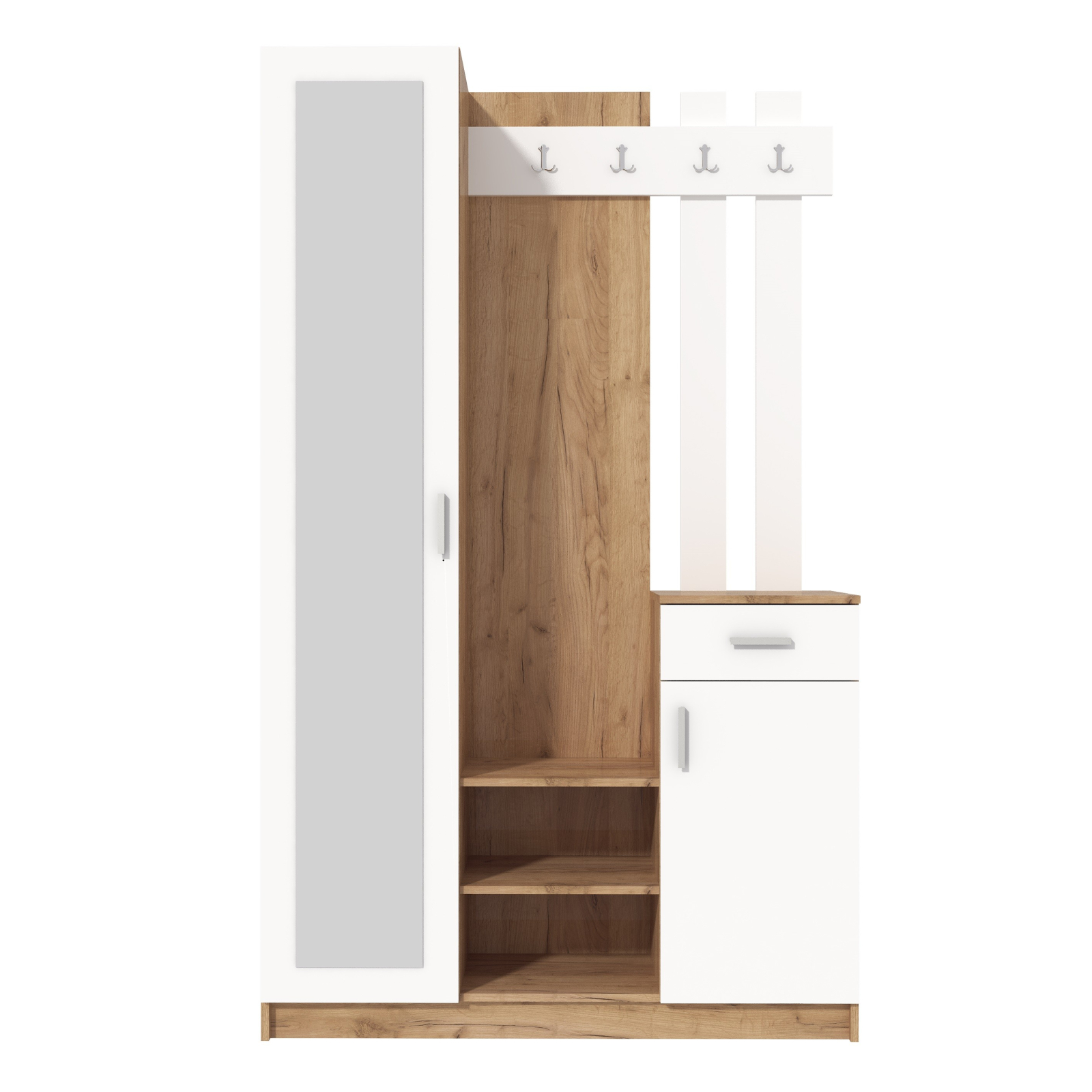 Cuier pentru hol realizat din PAL melaminat, cu design modern și compartimentare practică, prevăzut cu oglindă, polițe, sertar și agățători duble, ideal pentru organizarea eficientă a spațiului de intrare.