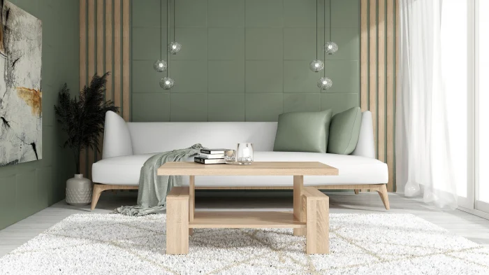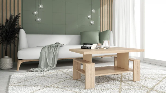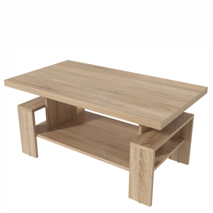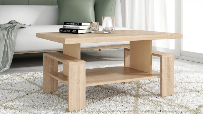 Masă de cafea cu design modern, realizată din PAL melaminat, ideală pentru living. Blatul dublat cantuit cu ABS oferă un plus de rezistență și durabilitate, iar forma dreptunghiulară permite integrarea ușoară în diferite tipuri de amenajări.