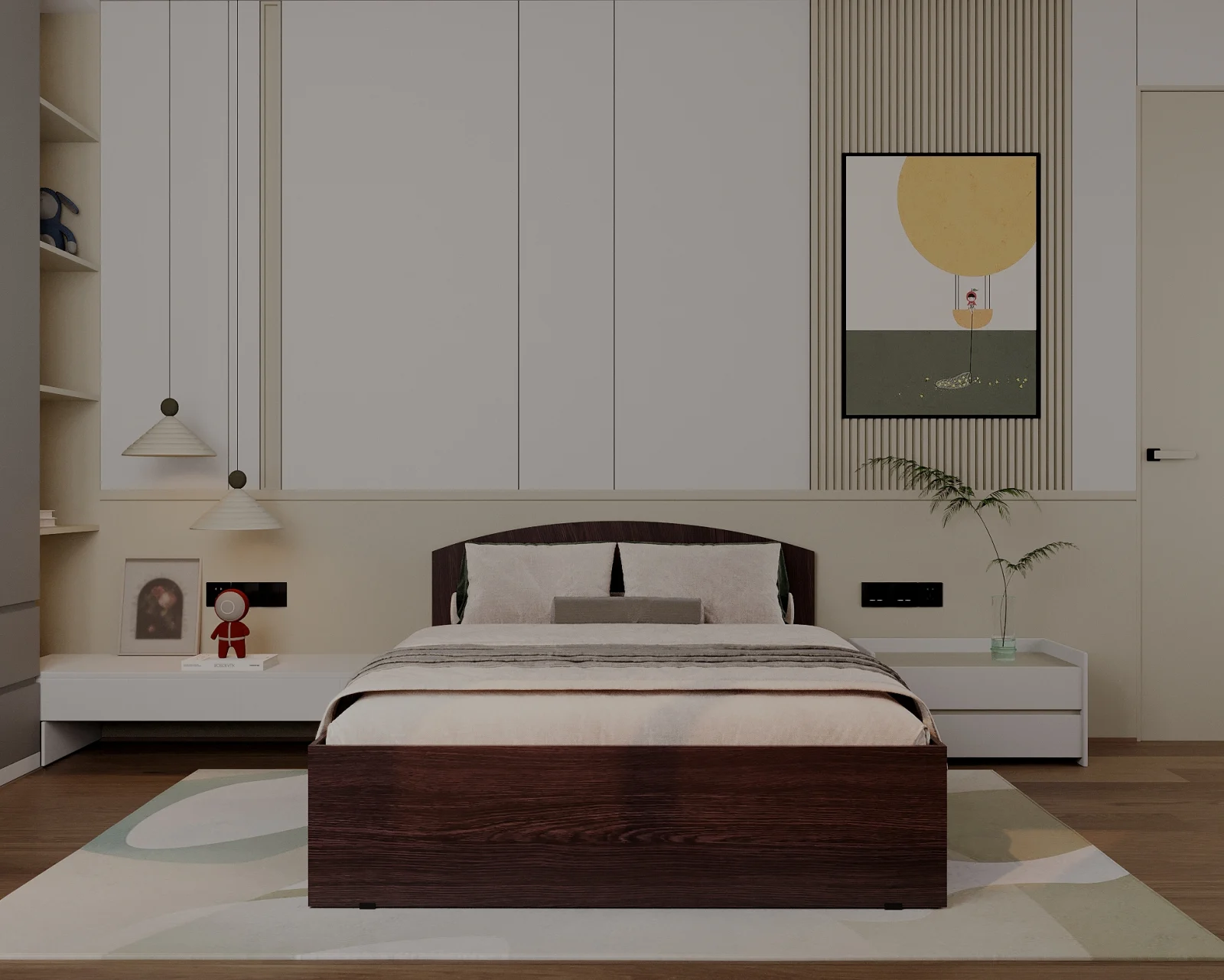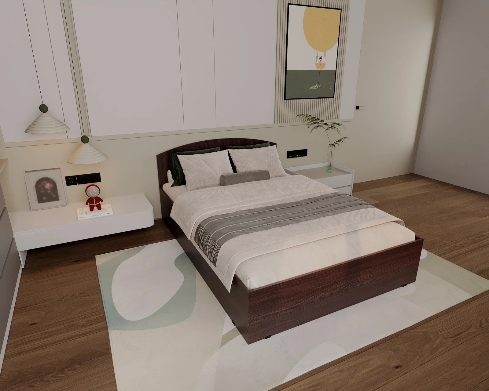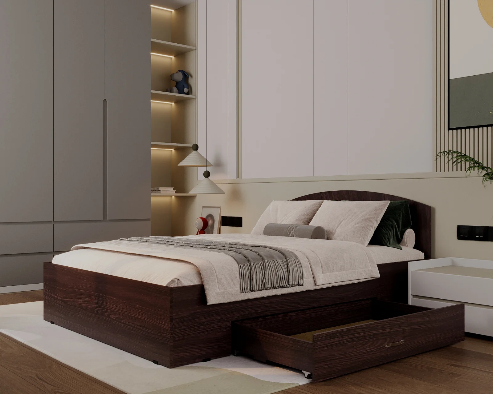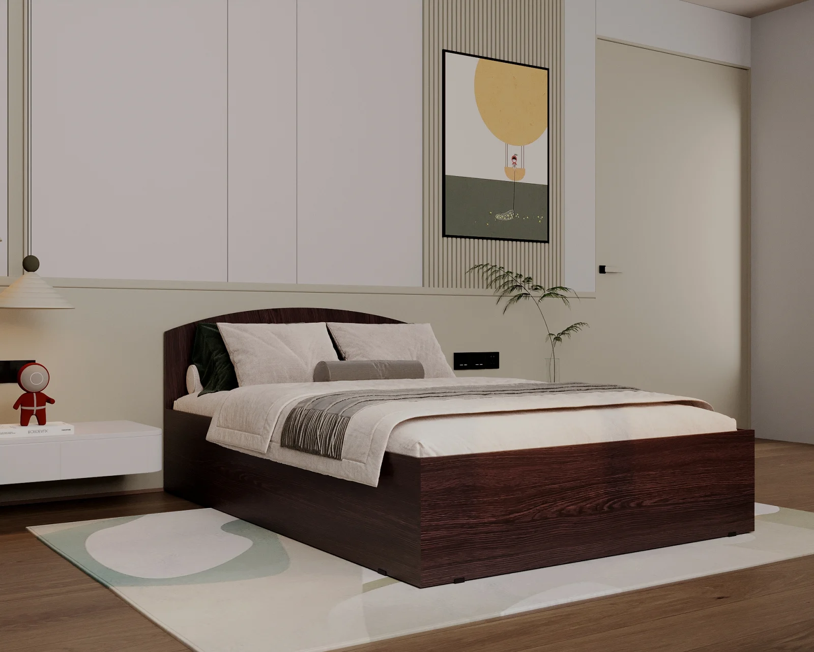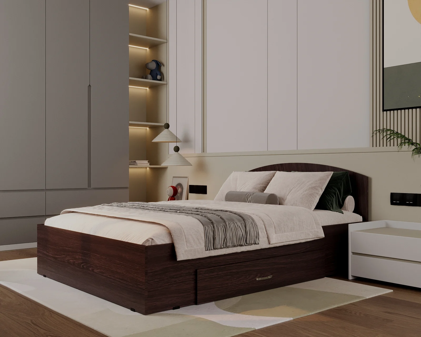 Pat realizat din PAL melaminat Wenge, prevăzut cu sertar lateral pentru depozitare, potrivit pentru amenajarea unui dormitor modern și funcțional.