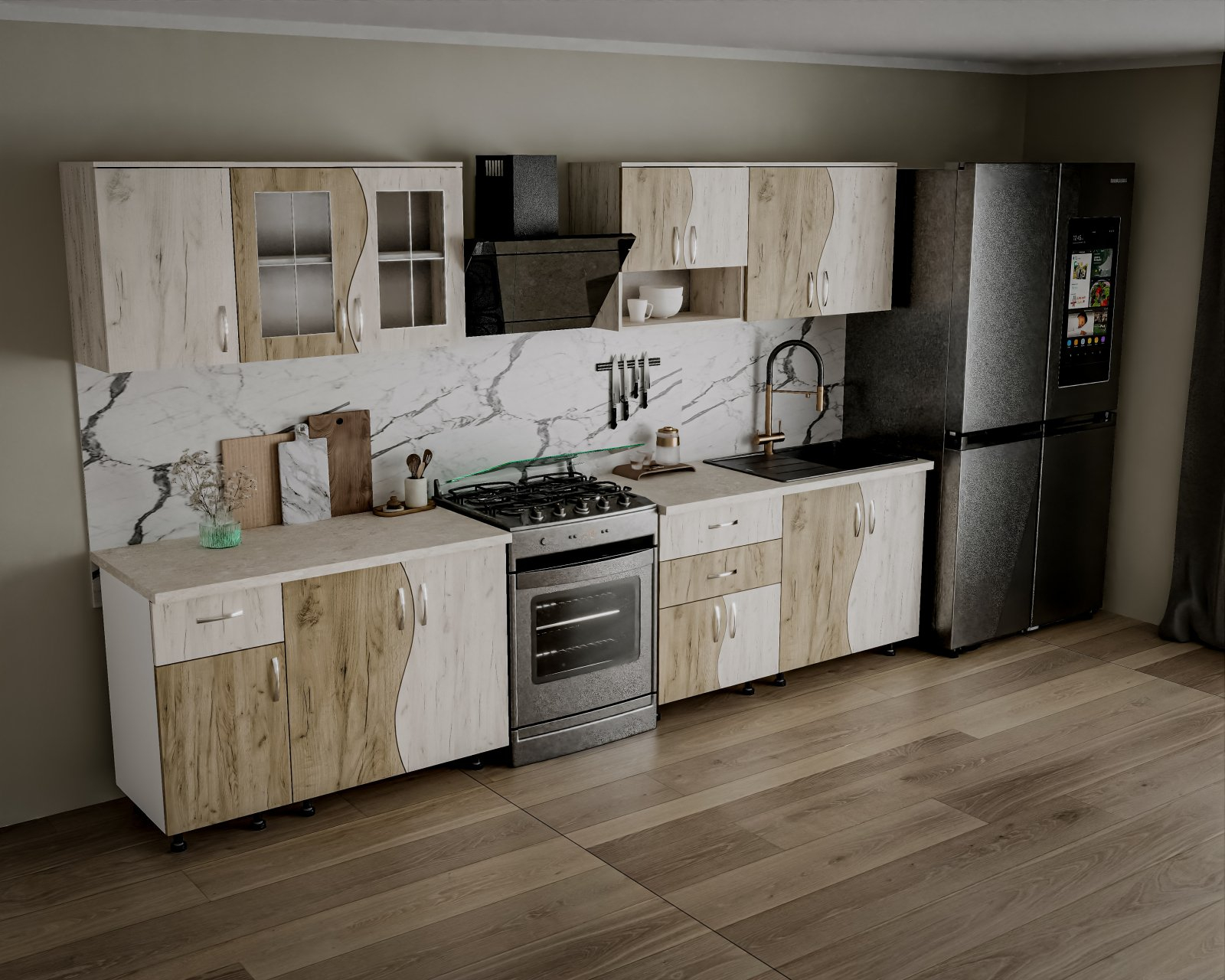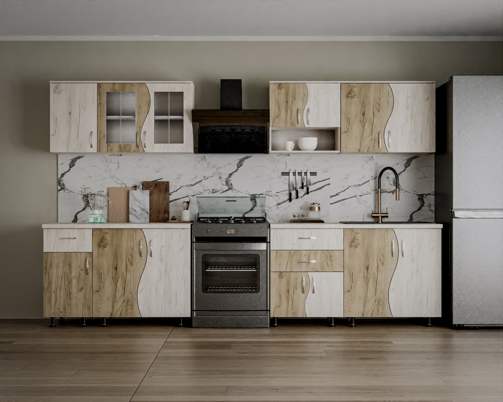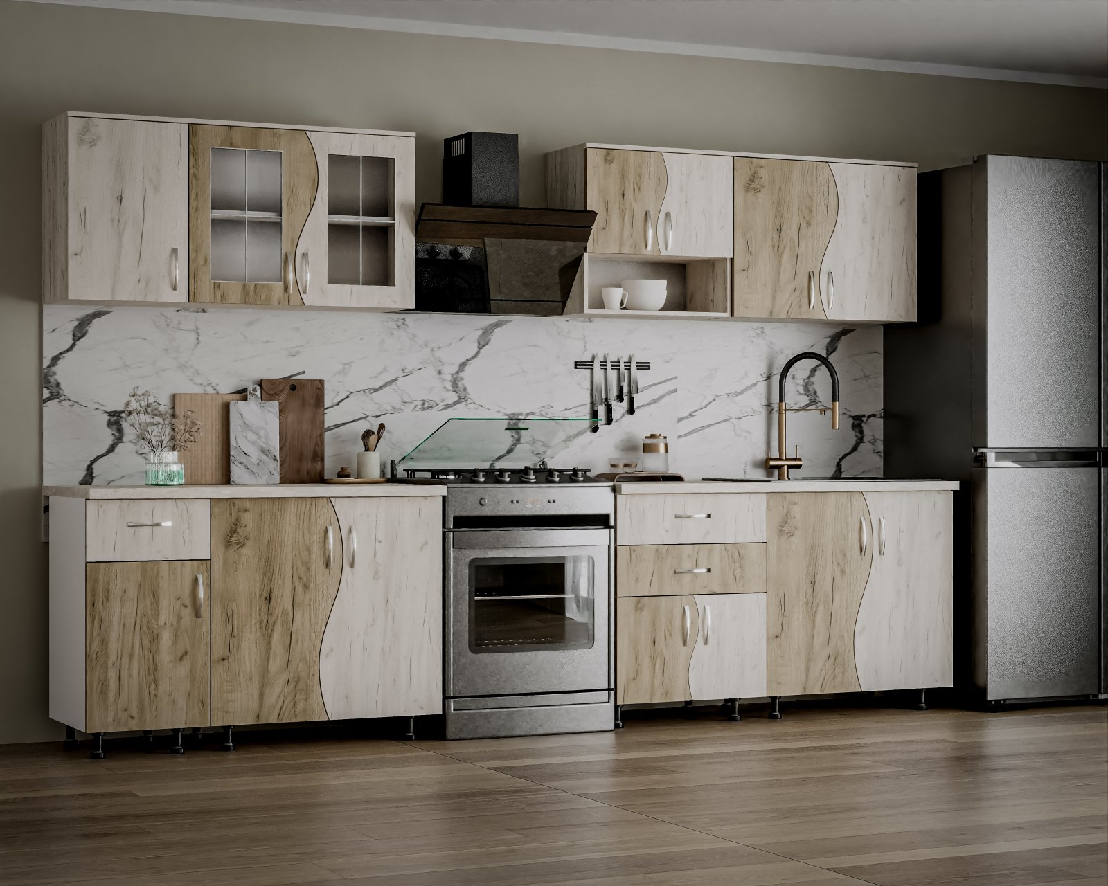 | Parte inferioară | 80 cm (2 uși), 60 cm (2 uși + 2 sertare), 40 cm (1 sertar + 1 ușă), mască chiuvetă |