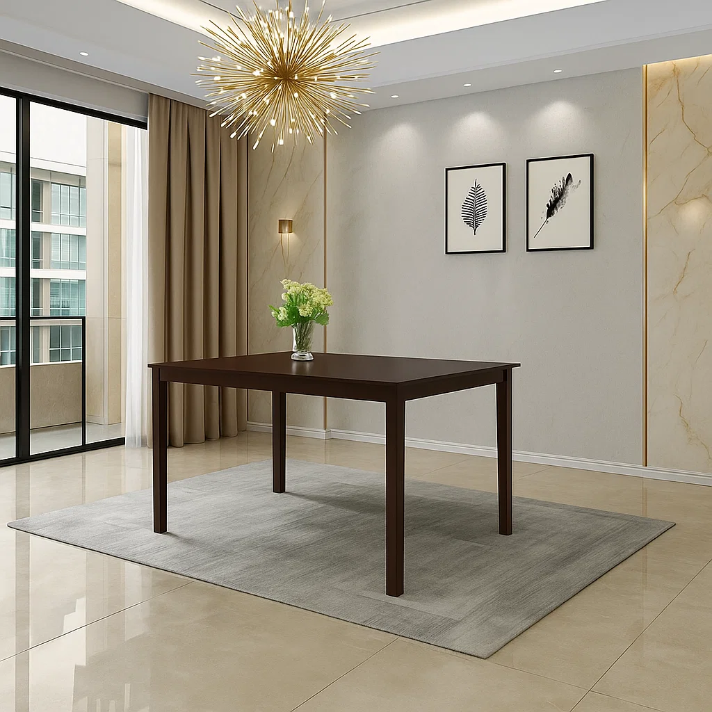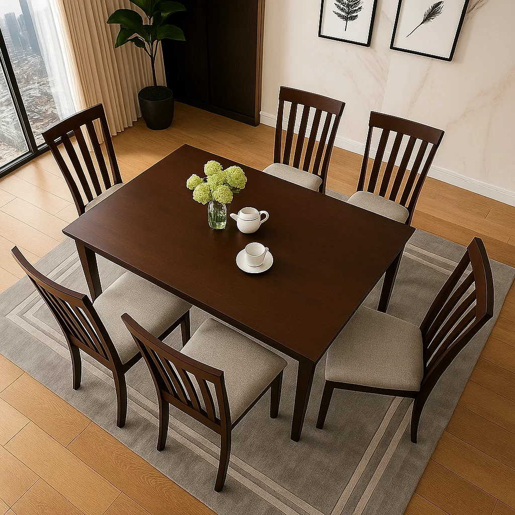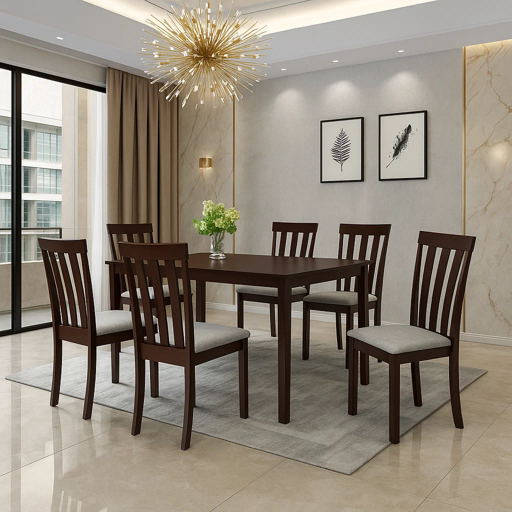 Set masa si 6 scaune tapitate, cu un design elegant, durabil si foarte usor de asortat in orice tip de living sau bucatarie. Indiferent ca e pozitionat in living sau in bucatarie, va fi, cu siguranta piesa centrala a acestei incaperi. Masa este dreptunghiulara, usor de intretinut si rezistenta. Scaunele sunt tapitate, cu un strat de burete pe sezut, pentru un plus de confort si acoperit cu stofa.