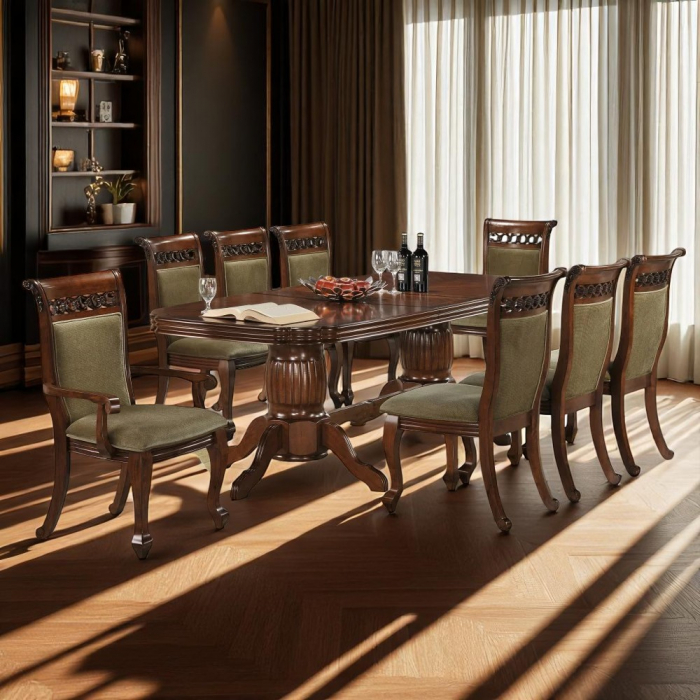 Set masa si 8 scaune tapitate, cu un design elegant, durabil si foarte usor de asortat in orice tip de living sau bucatarie. Indiferent ca e pozitionat in living sau in bucatarie, va fi, cu siguranta piesa centrala a acestei incaperi. Masa este dreptunghiulara, usor de intretinut si rezistenta. Scaunele sunt tapitate, cu un strat de burete pe sezut, pentru un plus de confort si acoperit cu stofa.