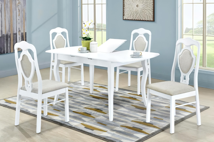 Set format din masă extensibilă și 4 scaune tapițate, potrivit pentru bucătărie sau living. Design clasic, ușor de integrat în orice ambient. Scaunele sunt capitonate cu burete și tapițate cu stofă rezistentă.