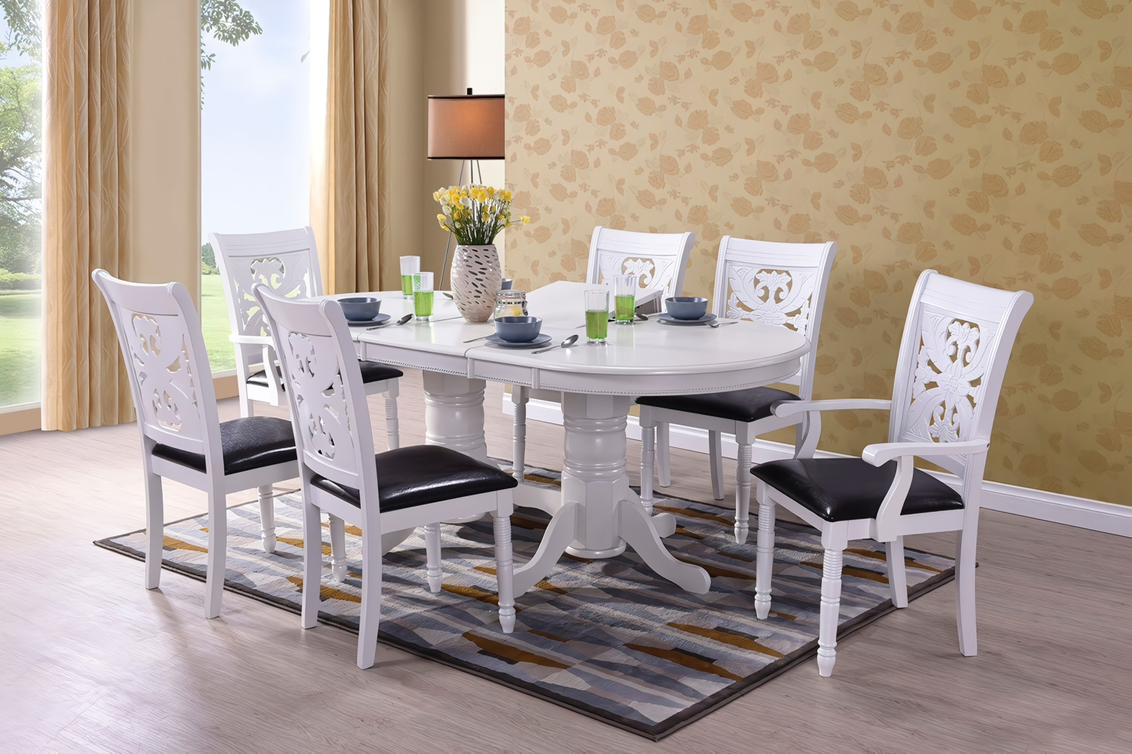 Set format din masă extensibilă și 6 scaune tapițate, potrivit pentru bucătărie sau living. Design elegant, ușor de integrat în orice decor.